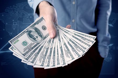 Young businessman holding large amount of bills with blue charts in the background