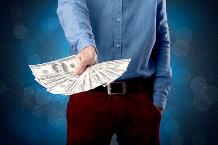 Young businessman holding large amount of bills with shiny blue background