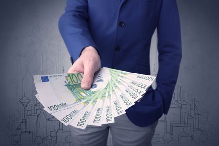 Young businessman holding large amount of bills with grungy drawings of a city and numbers behind him