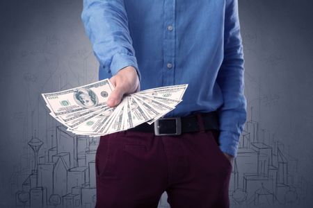 Young businessman holding large amount of bills with grungy drawings of a city and numbers behind him
