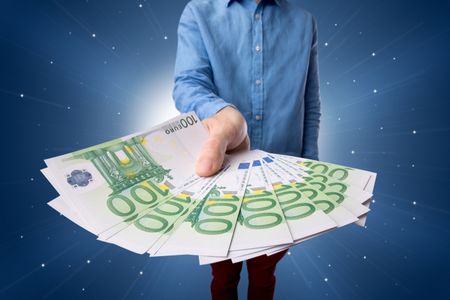 Young businessman holding large amount of bills with light beams behind him