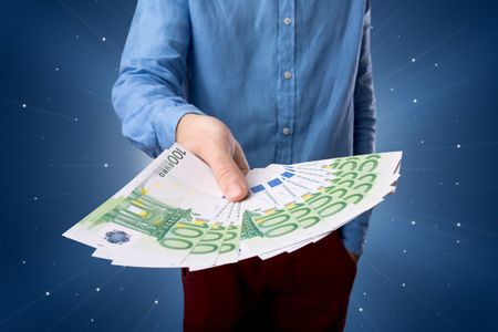 Young businessman holding large amount of bills with light beams behind him