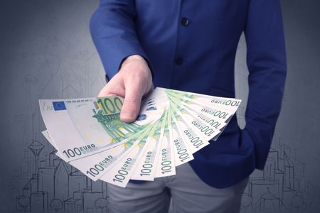 Young businessman holding large amount of bills with grungy drawings of a city and numbers behind him