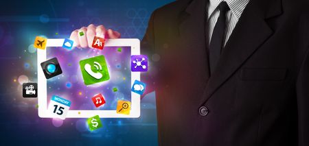 Young businessman holding a tablet with modern colorful apps and icons