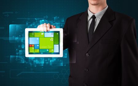 Young businessman holding a tablet with modern software operational system