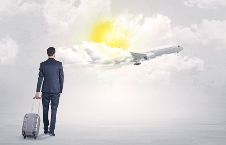 Young businessman with luggage walking towards to a raising airplane