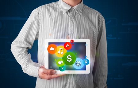 Young businessman presenting colorful modern signs
