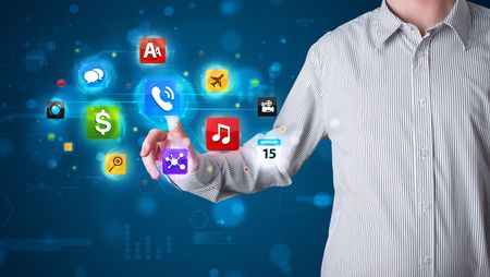 Young businessman pressing various collection of buttons
