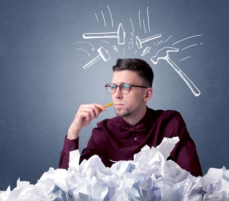 Young businessman sitting behind crumpled paper with drawn hammers hitting his head