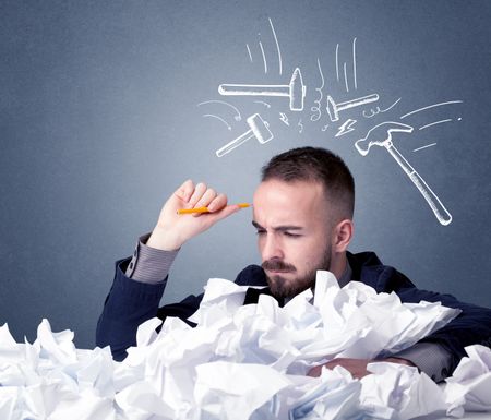 Young businessman sitting behind crumpled paper with drawn hammers hitting his head