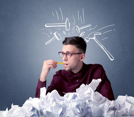 Young businessman sitting behind crumpled paper with drawn hammers hitting his head