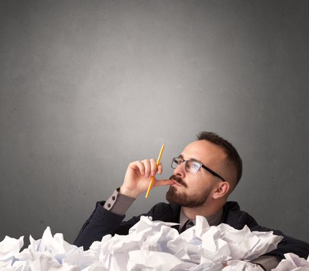 Young businessman sitting behind crumpled paper with grey background