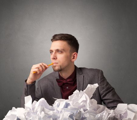 Young businessman sitting behind crumpled paper with grey background