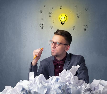 Young businessman sitting behind crumpled paper with lightbulbs above his head