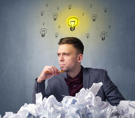 Young businessman sitting behind crumpled paper with lightbulbs above his head