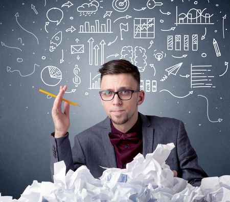Young businessman sitting behind crumpled paper with mixed drawings over his head