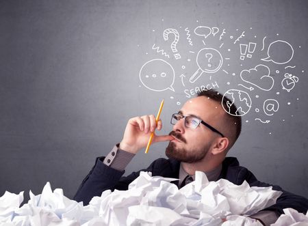 Young businessman sitting behind crumpled paper with mixed doodles over his head