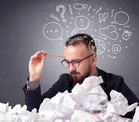 Young businessman sitting behind crumpled paper with mixed doodles over his head