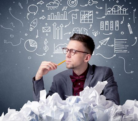 Young businessman sitting behind crumpled paper with mixed drawings over his head