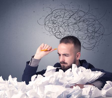 Young businessman sitting behind crumpled paper with scribbles over his head