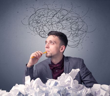 Young businessman sitting behind crumpled paper with scribbles over his head