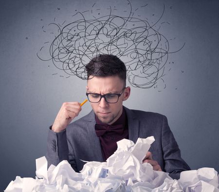 Young businessman sitting behind crumpled paper with scribbles over his head