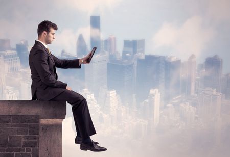 A young businessman sitting at the edge of a building in front of a city center scape background with tall buildings and clouds concept