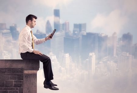 A young businessman sitting at the edge of a building in front of a city center scape background with tall buildings and clouds concept