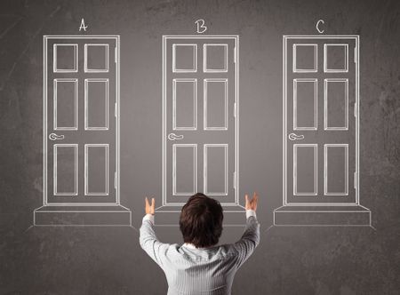 Young businessman sitting in front of a chalkboard and trying to choose the right door