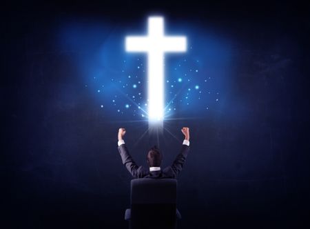 Young businessman sitting in an office chair with glowing cross above his head