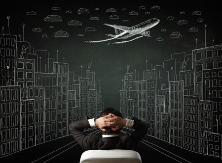 Young businessman sitting in an office chair and looking on a sketched cityscape drawing on a chalkboard