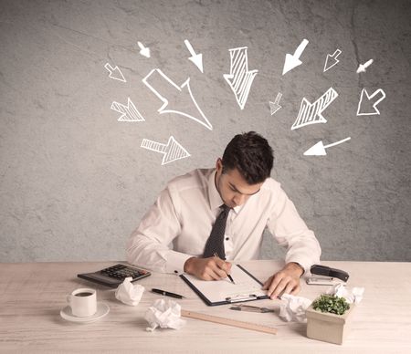 A young businessman sitting at an office desk and working on paperwork with drawn arrows pointing at his head concept