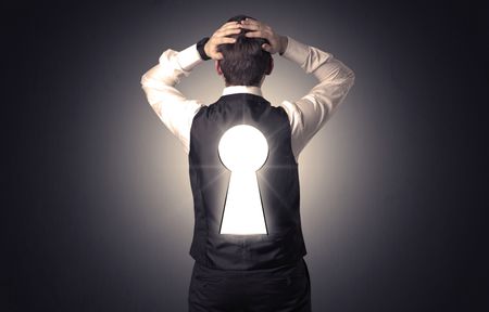 Young businessman standing and thinking with black keyhole on his back