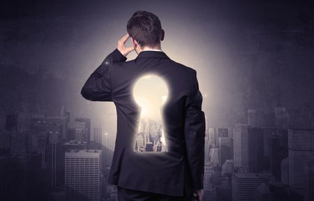 Young businessman standing and thinking with keyhole on his back and city graphic around