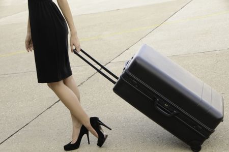 Young businesswoman in high heels and black dress drags a black suitcase across tarmac at airport