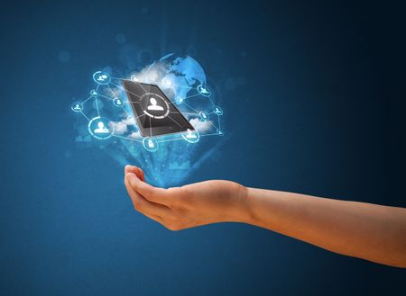Young businesswoman presenting cloud technology in her hand
