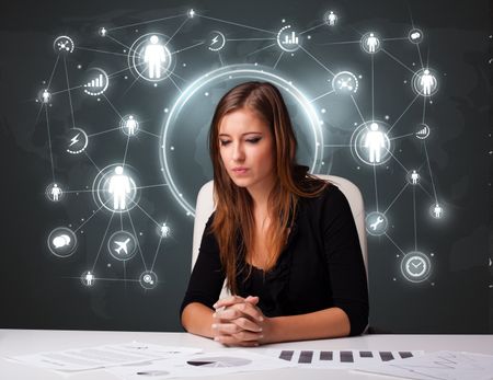 Young businesswoman sitting at desk with social network icons
