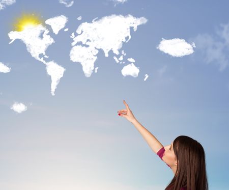 Young casual girl looking at world clouds and sun on blue sky