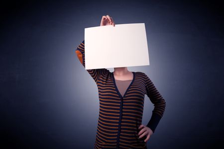 Young casual woman hiding behind a blank piece of paper