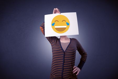 Young casual woman hiding behind a laughing emoticon on cardboard