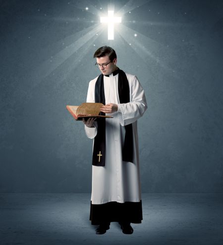 A young caucasian priest with deep faith blessing with the holy bible in his hand in front of blue wall background with illustrated glowing cross concept.