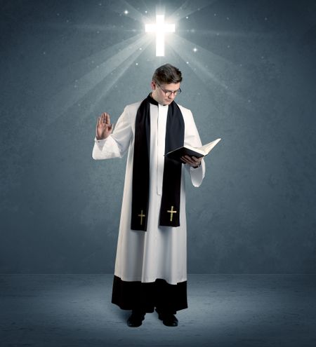 A young caucasian priest with deep faith blessing with the holy bible in his hand in front of blue wall background with illustrated glowing cross concept.