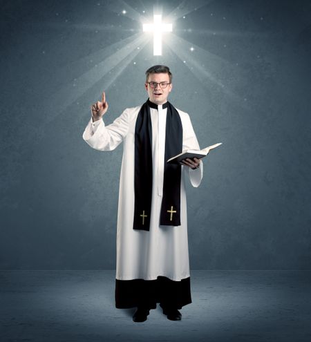 A young caucasian priest with deep faith blessing with the holy bible in his hand in front of blue wall background with illustrated glowing cross concept.