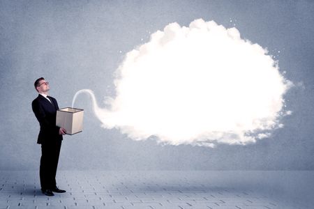 A young cheerful business person holding a cardboard box with illustration of white empty cloud concept.