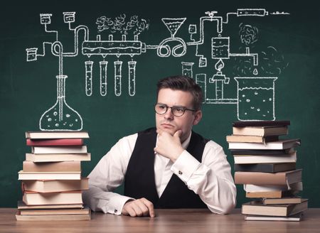 A young chemistry teacher in the middle of a chemical process explanation with tubes, reactions drawn on the blackboard back to school concept.