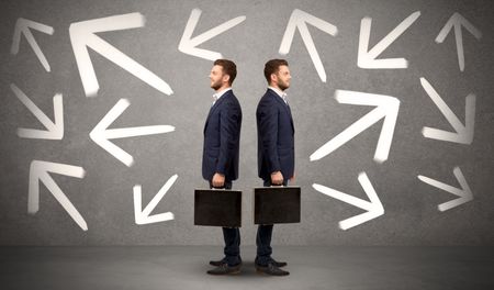 Young conflicted businessman choosing between two directions with arrows around him