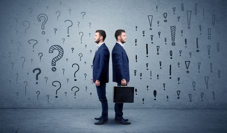 Young conflicted businessman choosing between two directions with question and exclamation marks