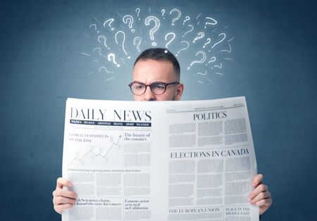 Young confused businessman reading daily newspaper with question marks above his head