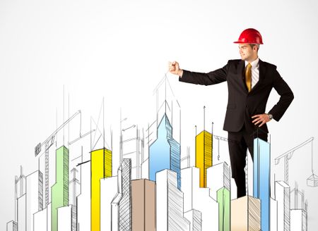 A young construction site worker in a red safety helmet happily sketching a colorful city sight, drawing lines, arrows, angles, cranes buildings with a pen in his hand