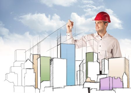A young construction worker in a red safety helmet happily planning a city sight and drawing lines, arrows, angles, buildings with a pen in his hand